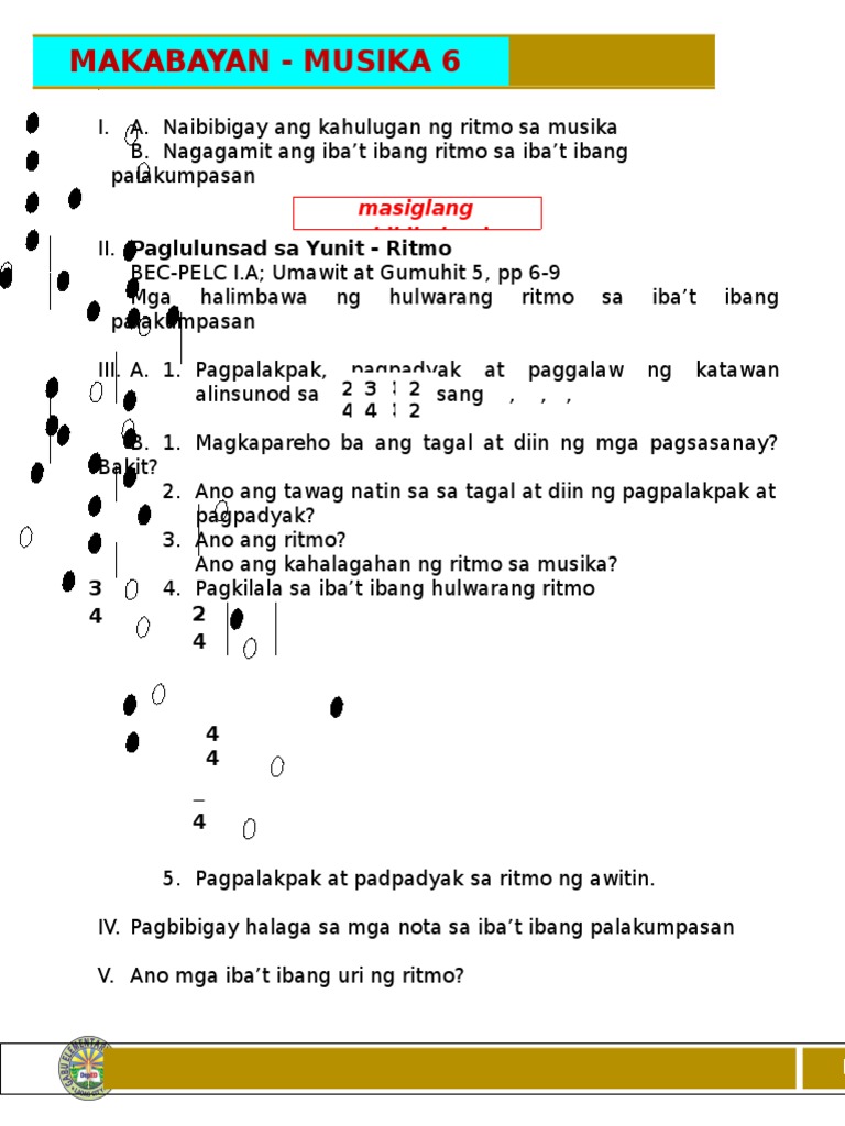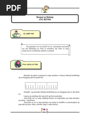 Patuloy na nakapagpapakita ng pakikiisa pagpipigil sa sarili paggalang sa isat isa at pagkamamamayan. ALAMIN MO PAG-ARALAN MO Sa pagtatapos mo ng modyul na ito maasahang masasabi mo ang kahulugan ng ritmo at natutukoy ang ritmo sa mga komposisyon at dibuhong nakikita sa paligid. Tumutukoy sa pagkahaba at pagkaikli na mga pattern sa pamamagitan ng nagbibigay-diin at hindi nagbibigay-diin na mga pantig.